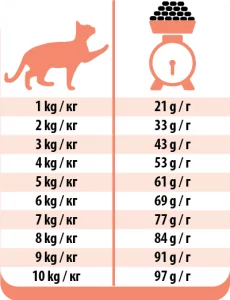 Zalecana dawka karmy ma charakter orientacyjny. Indywidualne dzienne zapotrzebowanie Twojego kota powinno być dostosowane do jego wieku, płci, rasy , stanu organizmu i aktywności fizycznej. Niektóre koty potrzebują więcej czasu na przyzwyczajenie się do nowej karmy, dlatego przez okres 5-6 dni wprowadzaj karmę stopniowo, codziennie zwiększając jej ilość.
